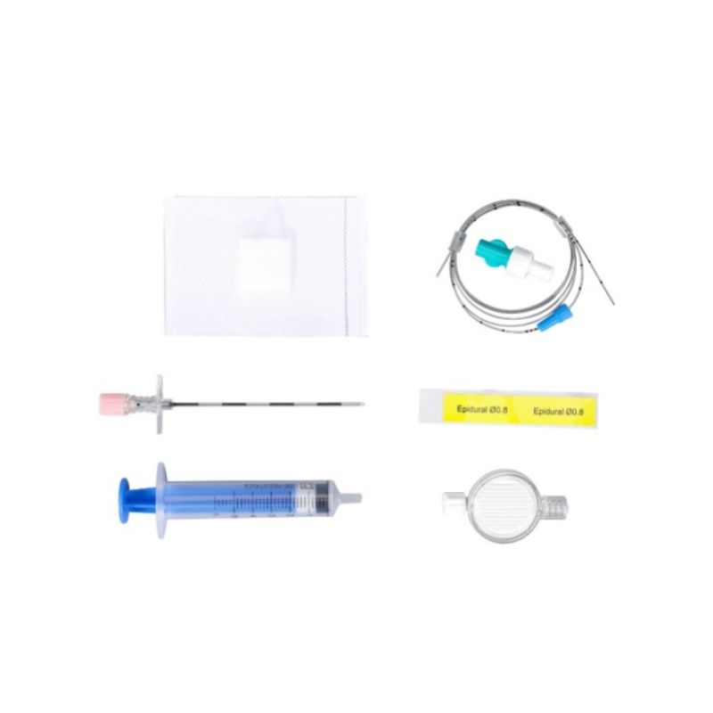 Комплет за епидуралну анестезију састоји се од епидуралне игле, епидуралног катетера (општег типа или ојачаног типа), уводне игле, водича за увод, конектора за катетер, филтера за течност и шприца са малим отпором. Користи се за епидуралну пункцију и убризгавање течних лекова у епидурални простор током епидуралне анестезије.